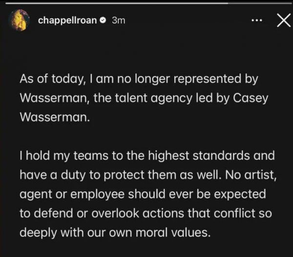 她在互联网上写道:“从今天起,我不再与凯西·沃瑟曼领导的沃瑟曼经纪公司合作。我对我的团队要求极高,我有责任保护他们所有人。任何艺人、经纪人或员工都不应该被要求为那些严重违背我们道德准则的行为辩护或视而不见。”