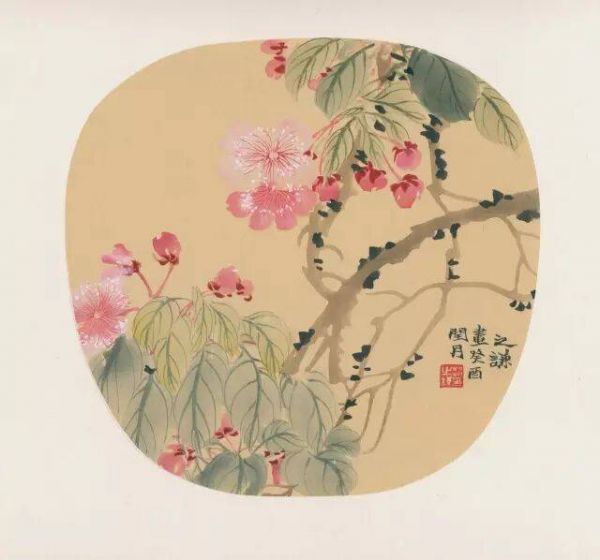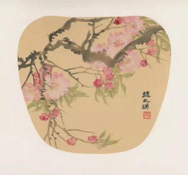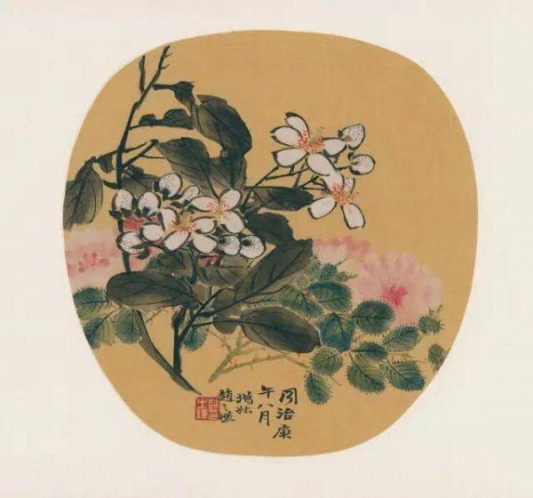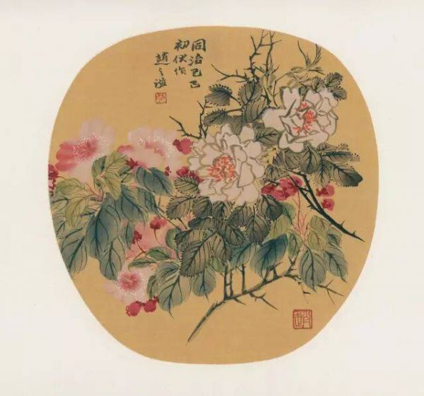 赵之谦的书画纨扇最为人称道,所绘折枝花卉活色生香,敷彩妍丽明润,用笔古茂沉雄,戛戛独造。朵云轩1950年代末雕印了《蔷薇》、《虞美人》、《月季海棠》、《万年青》四页赵之谦纨扇小品,以纸托画片纸袋装发行。