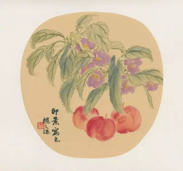 1980年,又梓行了赵之谦《紫薇玉簪》、《海棠》、《红桃》、《凤仙李子》四页纨扇小品,并重印了前四页,集辑精裱成此《赵之谦花卉册》。