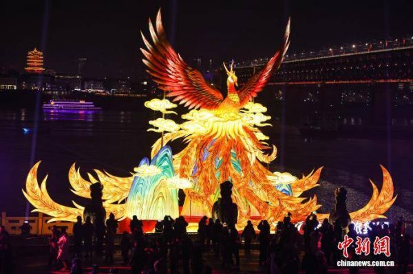 2月10日,农历腊月二十三,中国北方小年,2026武汉新春晴川灯会正式亮灯向市民开放,千米江滩化身光影长卷,黄鹤楼、武汉长江大桥、龟山电视塔与璀璨花灯同框,呈现出一幅“江汉揽胜”新图景。图为高达12米的“凤舞九天”与对岸黄鹤楼遥相呼应。中新社记者 张畅 摄