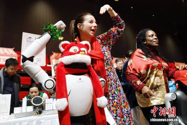 2月10日农历腊月二十三,中国北方小年,北京市麦子店街道中外居民过大年活动在微博IN跨次元引力场内开幕。来自塞尔维亚、英国、法国、莫桑比克、乌兹别克斯坦等10余个国家的40余位外籍友人与本地居民代表齐聚一堂,共庆佳节。图为外籍友人与机器人合影。中新社记者 韩海丹 摄
