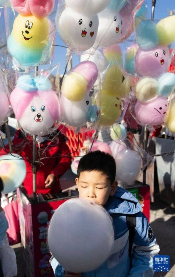 在北京市昌平区沙河大集,一名儿童在吃棉花糖(2月8日摄)。