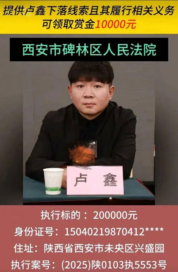 网传信息显示,提供卢鑫下落线索且其履行相关义务,可领取赏金1万元。执行法院为“西安市碑林区法院”,执行案号(2025)陕0103执5553号。