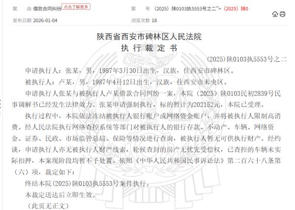 记者从中国裁判文书网查询到,《碑林区法院执行裁定书》【(2025)陕0103执5553号之二】显示,2025年12月15日,张某申请强制执行,被执行人卢某,标的暂计为202152元,本院已受理。