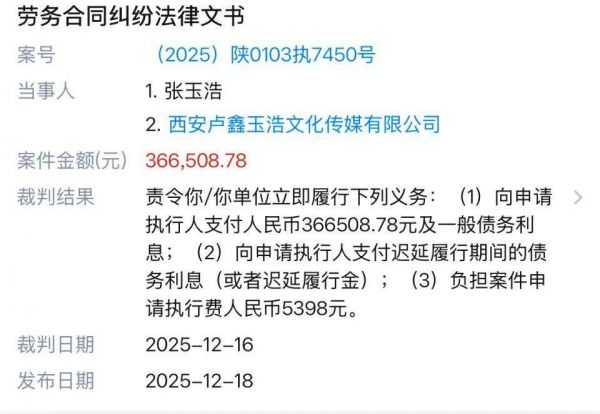 2025年9月10日,张玉浩因劳务合同纠纷,向碑林区法院申请对西安卢鑫玉浩文化传媒有限公司执行,案号(2025)陕0103执7450号。申请执行内容为,36.65万元及一般债务利息;支付迟延履行期间的债务利息;负担案件申请执行费5398元。