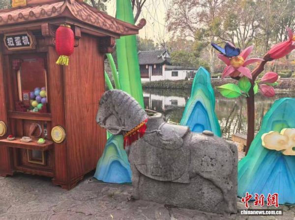 在上海古猗园南大门入口处,古典仕女雅逸身姿与“状元骑马”喜庆场景相映成趣,国风雅致与新春热闹氛围拉满。园内一尊明代的石马吸引了众多游人关注。这尊石马原是古代陵墓前的仪仗石刻,20世纪70年代南翔镇进行土地平整时被发现,之后被迁移到上海古猗园落户。