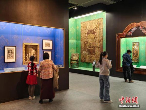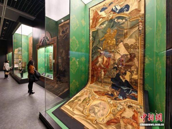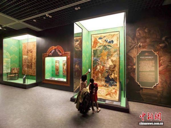2月13日,天津博物馆,民众在“荣耀之冠——18世纪意大利萨沃伊王朝宫廷珍宝展”参观萨沃伊王室挂毯。中新社记者 佟郁 摄