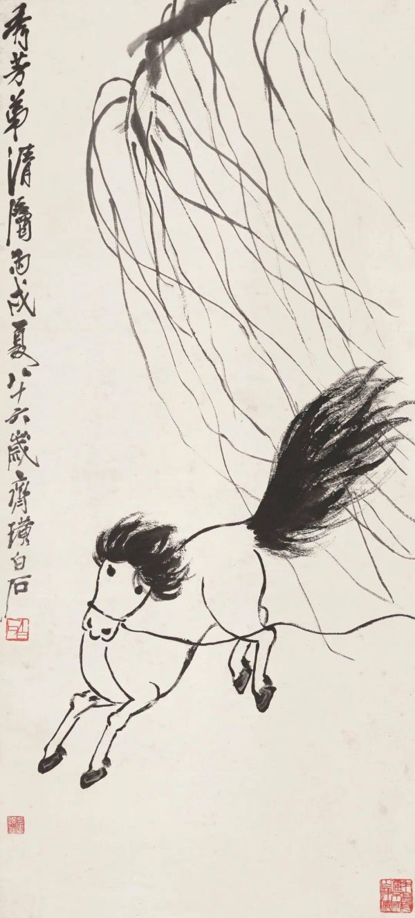 郎绍君先生在《齐白石的世界》一书中指出:“在中国人的思想中,马始终与征战相关,是骁勇和胜利的象征。白石画马,与徐悲鸿画马大异,徐氏重其形真,白石重其意气,徐氏以墨当色,笔墨服从于造型,白石全出之以勾勒,写其大意而已。”