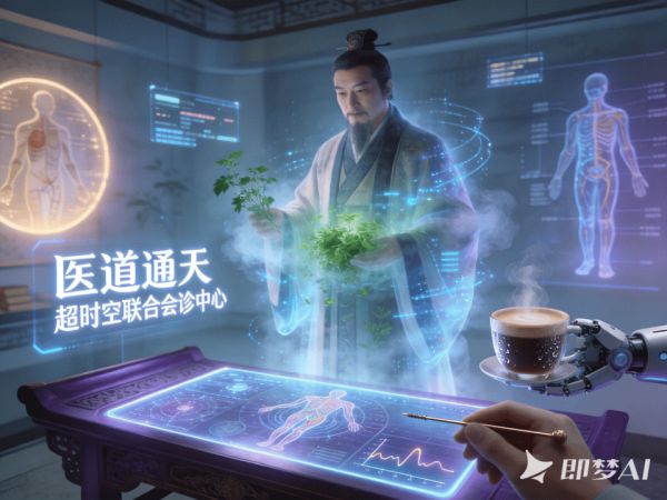 扁鹊从一阵混合着草药清香与数据流光的雾气中现身,发现自己站在“医道通天”在线问诊平台的“超时空联合会诊中心”,他身前的紫檀木案几变成了悬浮触控屏,手边的铜针旁多了一杯AI助手刚递上的热美式。