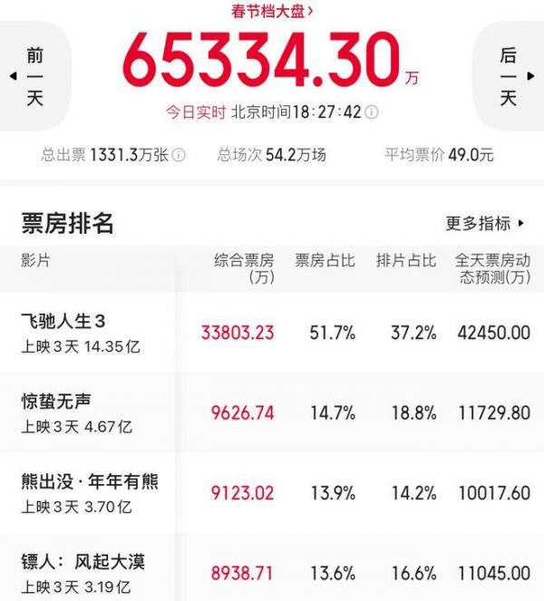 不过春节档中也有一部备受关注的新片,还是由韩寒执导的“飞驰系列”,目前《飞驰人生3》的票房一骑绝尘遥遥领先,已超过第二名的《惊蛰无声》近10亿,平台也对《飞驰人生3》寄予厚望,预测其最终票房能破50亿大关。