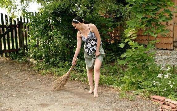 俄罗斯的乡下生活:妇女光着脚穿裙子打扫院子