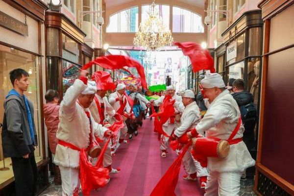 2月21日,来自中国陕西的安塞腰鼓、延川秧歌亮相伯灵顿拱廊街。新华社发(主办方供图)