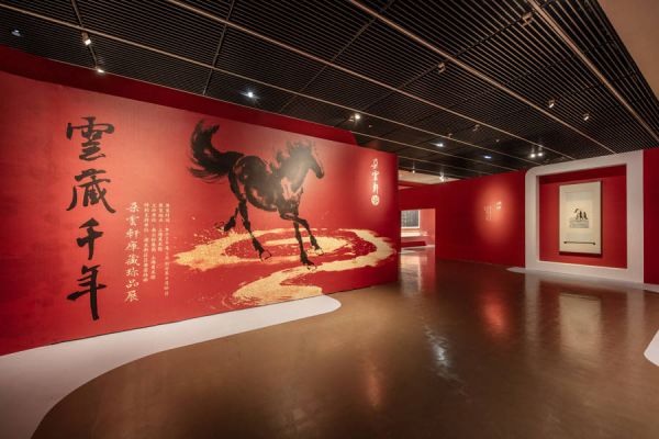呼应马年的马元素在这个展览随处可见,带来喜庆的年节氛围,也成为令人瞩目的打卡焦点。徐悲鸿笔下的水墨奔马放大数倍,跃上宫墙红的展墙,飞驰出“一马当先”的气势。启引展览四大篇章的作品,都是徐悲鸿笔下的马。其中,《渊渟》为两匹正在湖边饮水的骏马;《瞻途》为一匹高举前蹄回首的骏马,仿若昂立于天地之间;《驰远》中的马儿昂首奋蹄,鬃毛飞扬,精神抖擞,意气风发;不同于前三幅原作,《留云》是一幅木版水印作品,以朵云轩木版水印的工艺同朵云轩库藏珍品进行对话。刘旦宅宽3.67米、高1.41米的《八骏图》更是难得一见。这是一幅潇洒的群马图,只见八匹骏马聚散有致地分布在柳岸水塘之间,或嬉水洗尘,或嘶鸣腾跃,一派欢欣。