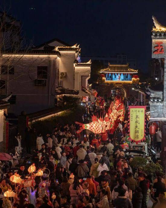 每天18时到21时,数百人甚至上千人的鱼灯巡游队伍会从三河古镇的万年台景点一起出发,经过古城墙、鑫樾阁、三县桥等核心景点,舞动着手工扎制的传统徽州鱼灯,穿行在古镇的街巷里。