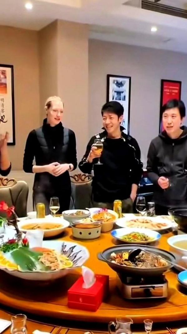 而他的妻子,李白,就坐在他旁边那个不那么起眼的位置。她穿着一件简单的米白色毛衣,金色的长发松松挽着。一整场饭局,你几乎听不到她说什么。她的大部分时间,都在照顾身边那对五岁的龙凤胎。孩子碗里的藕汤凉了,她轻轻吹温了递过去;儿子把米饭粒掉在桌上,她不动声色地用纸巾擦掉;女儿想够远处的粉蒸肉,她伸长胳膊夹过来,低声用中文说:“慢慢吃。” 只有当撒贝宁讲到一个特别妙的梗,全场爆笑时,她才抬起头,看向丈夫,嘴角弯起一个安静的、了然的弧度,眼睛像盛着光的琥珀。