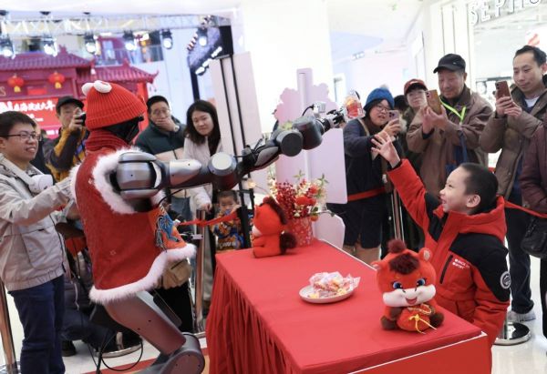 2月23日,小朋友在2026海淀新春科技庙会上与机器人互动。中国日报记者 邹红 摄