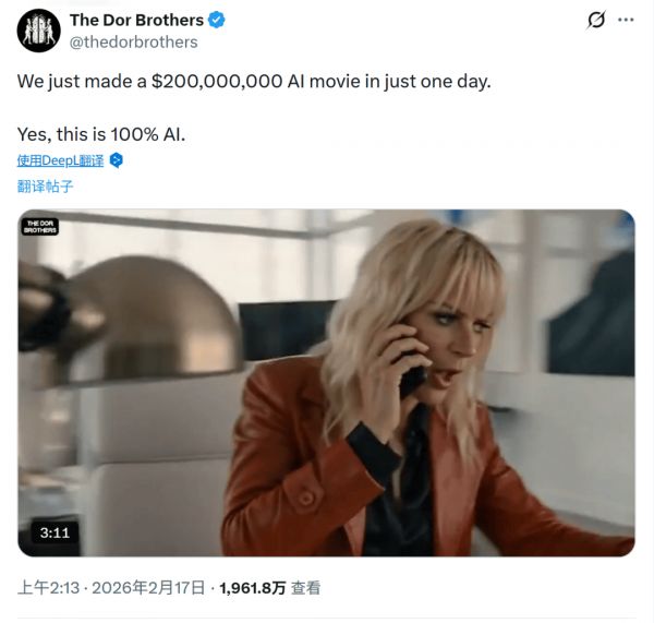 率先洗牌的甚至不是AI漫剧,而是电影和电视。春节前,以Kanye West为主要角色的《新鸳鸯蝴蝶梦》MV从微博火到了X,制作工具正是SeeDance 2.0。春晚节目《贺花神》的动态舞台同样由SeeDance 2.0制作完成,惊艳了所有人。海外电影制片人利用Seedance 2.0在一天时间内打造了一部号称价值2亿美元的AI短片,三天的播放突破1900万。