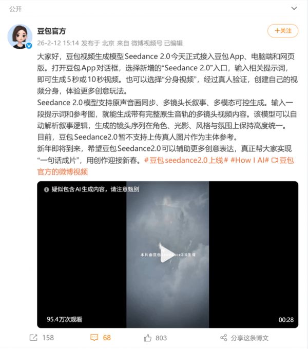 不过,生成速度缓慢的问题正在得到解决。2月12日,豆包正式官宣了SeeDance 2.0视频模型,并在豆包App内实装了SeeDance 2.0 Fast分流了部分普通用户的需求。无论是剪映还是即梦AI以及云雀,都能有更多空间给专业的内容生产助力加持。