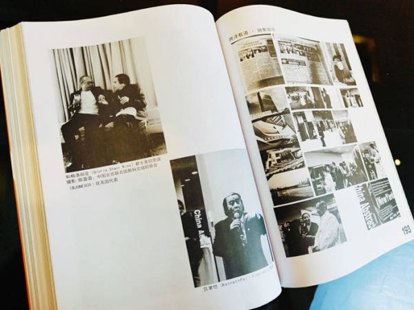 ▲ 在中国抽象艺术联合国展开幕式上与格洛丽亚爵士合影、贝聿恺先生致辞(茶学梅翻拍)