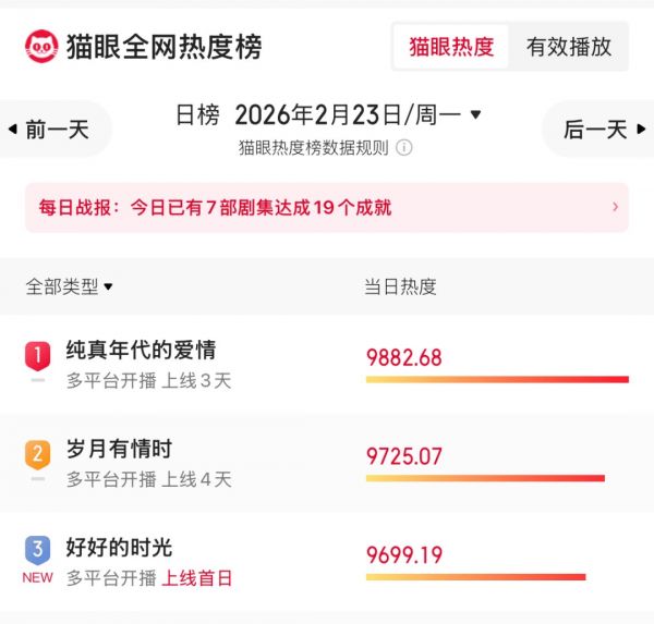 春节档后半段上线的“年代剧三部曲”:《岁月有情时》《纯真年代的爱情》《好好的时光》,成了无数人寄予厚望的救市之作。尤其是大年初七,猫眼专业版上剧集热度榜前三甲被年代剧包圆,也更助长了市场的信心。虽没有火到全网沸腾,但也在悄悄攻略市场。