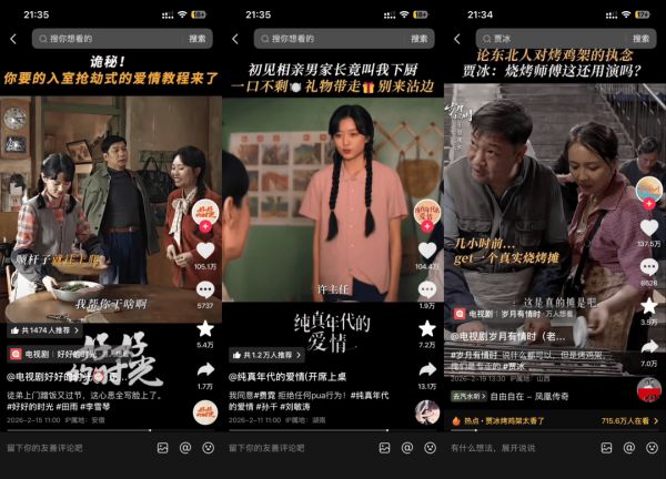 另一个有意思的现象是,官抖上三部剧皆有火爆出圈的切片(点赞超百万),但内容方向却是截然不同的。《好好的时光》里李雪琴的“入室抢劫式爱情教程”、《纯真年代的爱情》里孙千硬核拒绝男方家长的PUA、《岁月有情时》里贾冰以烤鸡架硬控剧组的花絮,这或许也指明了当代观众喜欢的年代剧方向:喜剧演员、爽感加倍,以及更能折射当代年轻人精神状态的东西。