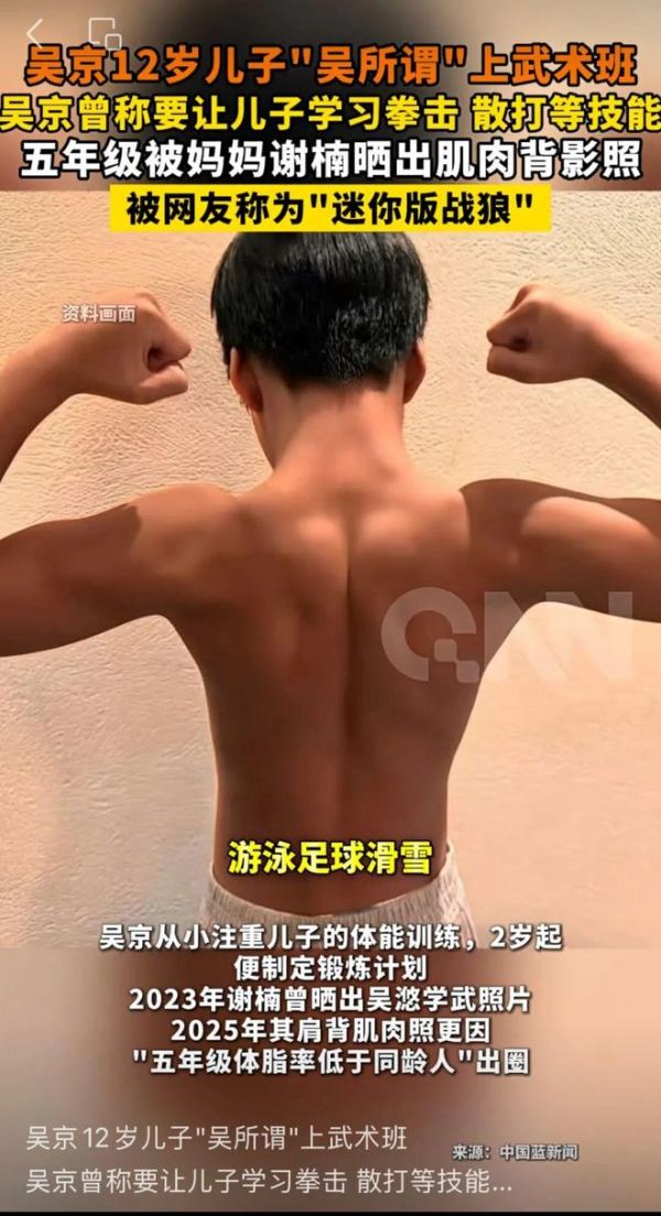据媒体报道,2月24日,有网友拍到吴京妻子谢楠陪同大儿子吴潞参加武术学习班。"吴所谓"身背长枪,在教室内练习动作有模有样。网友感叹"战狼基因强大"。吴京曾公开表示,计划让儿子在25岁前掌握拳击、散打、赛车、摩托车、游泳、足球、滑雪等多种技能,并强调从小注重体能训练的重要性。其训练目标包括培养“敢直面60吨坦克的硬核气魄”和达到一级运动员水平的体能标准。吴京妻子谢楠常陪同儿子训练,并曾晒出其肌肉照,被网友称为“迷你版战狼”。吴京认为武术不仅是强身健体的方式,更是传递坚持、尊重等精神的重要途径。吴京本人作为硬汉代表,也以自律和坚持为孩子树立了榜样。