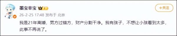 “墨宝非宝”称,离婚的核心原因是“男方为过错方,财产已分割干净”,且强调,过去5年隐瞒离婚事实,只为保护孩子的成长。