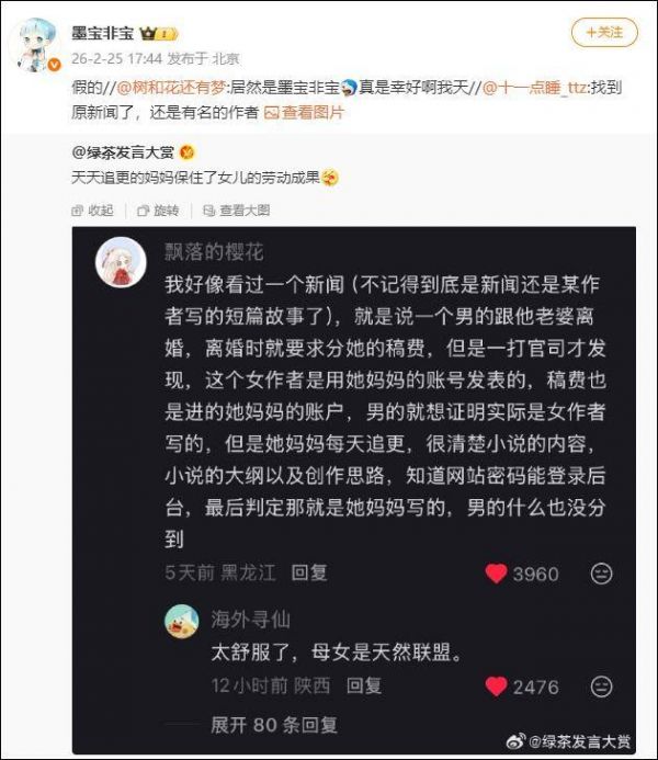 另外,近期网络流传“母女联手保住稿费防前夫”的传闻,称其早年用母亲身份注册写作账号以规避离婚财产分割。墨宝非宝直接辟谣,称该说法为“假的”。