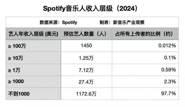 Chartmetric发布的报告指出,2024年,该平台追踪的1130万Spotify音乐人里,94.8%的人月听众量不到1000。Spotify数据则显示,2024年,年收入超过1万美元(约6.9万人民币)的音乐人仅占全部上传者的0.59%,而收入超过100万美元的音乐人更只占0.012%。