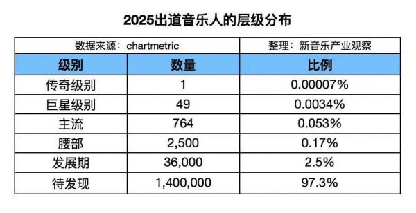 对于想要进入音乐市场的年轻人来说,高强度竞争压力是必须正视的现实。音乐数据平台Chartmetric发布的2025年年报显示,2025年出道的新人,只有0.053%的人能进入主流视野,97.3%的人作品无人问津。