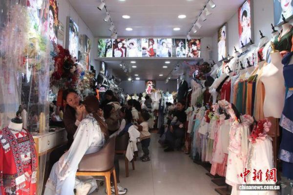 图为洛带古镇一家写真店内,游客正在进行妆造。陈选斌 摄