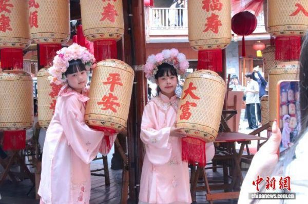 图为两名小女孩体验簪花写真,在喜庆的灯笼间留下童趣瞬间。陈选斌 摄