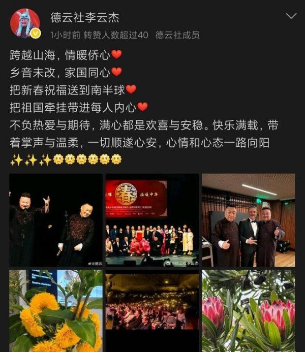 最近,德云社又搞了一个大动作——这次不是普通的商演,也不是简单的产品开箱,而是跟随中国艺术家代表团一起去澳洲搞公益演出!猜猜这次活动怎么样?不是德云社单打独斗,而是和曲协的演员们同台演出,而且这次的活动可不小,是官方主办的公益文化交流,核心目标是为侨服务+文化出海。也就是说,德云社带着相声评书去给澳洲的华人同胞们带去家乡的传统文化,也让我们的相声艺术在国外露脸,助力传统文化走出国门。这场演出从2月18号到23号,共演出5天,地点选在了悉尼歌剧院,足见这次活动的分量。