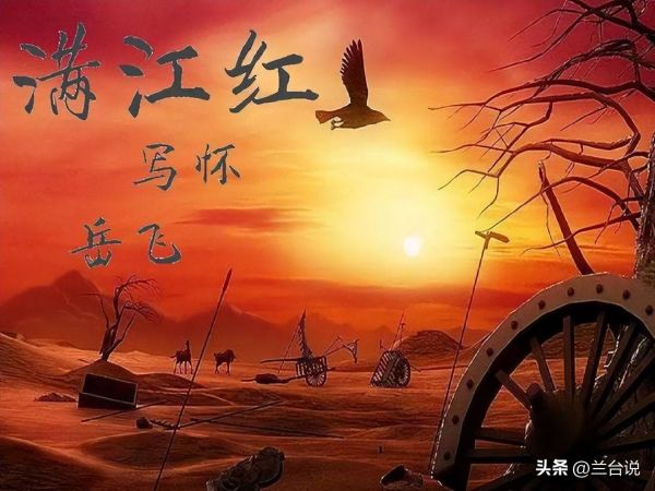怒发冲冠,凭阑处、潇潇雨歇。抬望眼,仰天长啸,壮怀激烈。三十功名尘与土,八千里路云和月。莫等闲、白了少年头,空悲切。靖康耻,犹未雪。臣子恨,何时灭。驾长车,踏破贺兰山缺。壮志饥餐胡虏肉,笑谈渴饮匈奴血。待从头、收拾旧山河,朝天阙。