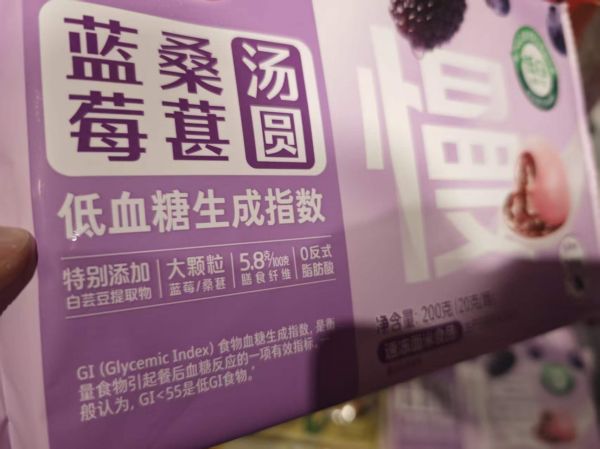 新京报记者走访市场看到,三全食品今年推出的蓝莓桑葚汤圆,在包装上打出低GI认证标识。湾仔码头推出“轻汤圆”系列,突出低糖、膳食纤维等特色,相关产品标示糖含量为5克/100克。沈大成旗舰店销售的无糖汤圆,宣称“0糖”标识真无糖,果糖、葡萄糖、蔗糖、麦芽糖、乳糖未检出。盒马融合中式养生理念,推出姜黄红豆薏米、五指毛桃桂圆枣泥汤圆等新品,将药食同源材料融入汤圆馅料创新。