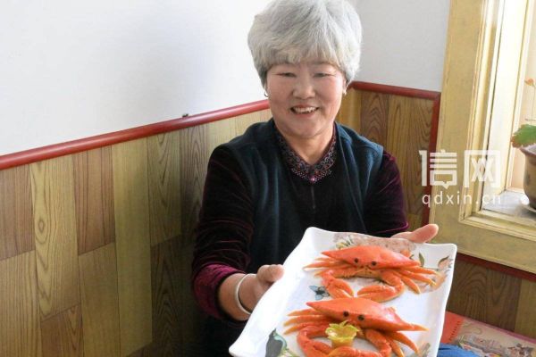 田横镇南芦村的农民宋玉芳在展示海鲜“螃蟹”造型的豆面灯。 (来源:即墨区委宣传部)