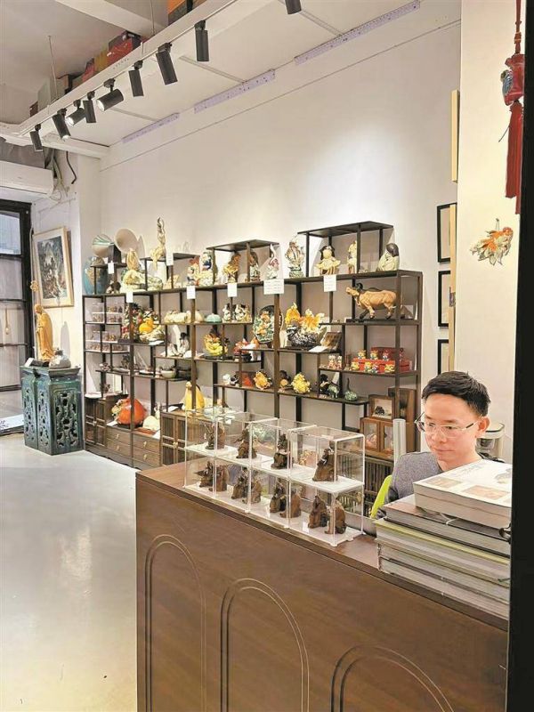 作为大芬村里少有的主营石湾公仔的商户,廖选辉的店铺“一旧云手艺”早已成为不少游客和藏家的打卡地。正月初八早8点,他准时推开店门,第一件事便是细细擦拭展柜里的陶塑。指尖抚过“跃马扬威”公仔舒展的鬃毛,拂去“瓦脊公仔”摆件上的微尘。“石湾公仔是非遗手艺,过年摆在家里,图的是‘意头’,我得让它们以最好的样子见人。”廖选辉一边擦,一边轻声说道。
