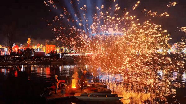 夜色渐浓,园区非遗打铁花表演随之登场。滚烫的铁水被匠人奋力击打,凌空挥洒间化作漫天“金雨”,火树银花在夜空璀璨绽放。“这是我第一次现场看打铁花,太壮观了!”站在人群前排,目不转睛盯着表演的学生小吴激动地说。游客们纷纷举起手机,定格这震撼瞬间,惊叹声与打铁花的声响交织,将元宵之夜的氛围推向高潮。