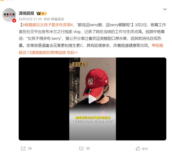 3月2日,杨幂工作室发布米兰之行独家vlog,记录她在当地的工作与生活点滴。视频中,杨幂分享道:“女孩子得多吃 berry”,并透露自己一直很喜欢这类酸甜口感的水果,因为既助消化又低热量,轻松又健康。