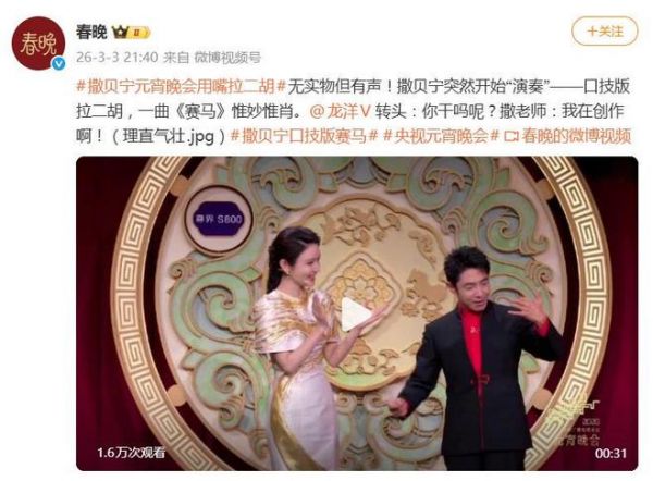 撒贝宁元宵晚会用嘴拉二胡,有模有样放飞自我,给龙洋都整懵了