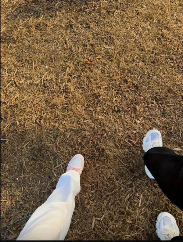 照片采用低调俯拍视角,只有一双穿白色运动鞋的脚与一双穿粉色运动鞋的脚,并排站立在草地上。这种甜度爆表的秀恩爱方式,将私底下的浪漫氛围展现得淋漓尽致。