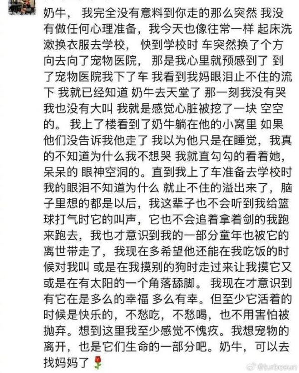 孙俪发文悼念小狗奶牛离世,儿子等等为奶牛写日记太好哭
