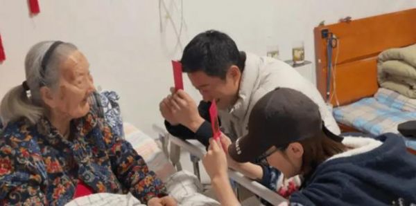 51岁吴京陪老婆谢楠回娘家,给奶奶过103岁生日,夫妻俩跪地祝寿
