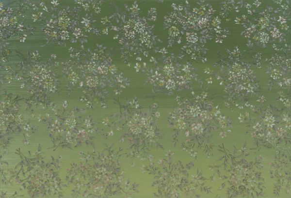 中国艺术家梁远苇2011年的作品《穿过玻璃》则带有东方禅意,梁远苇将家庭中常见的旧式纺织品、墙纸或窗帘这些平面纹样油画化,探讨了物质文明与个人记忆的链接。