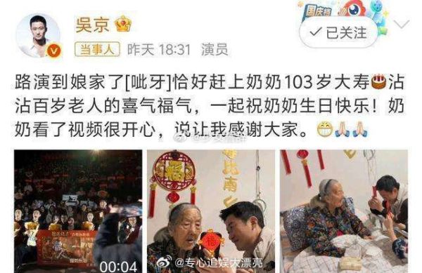 51岁吴京陪老婆谢楠回娘家,给奶奶过103岁生日,夫妻俩跪地祝寿