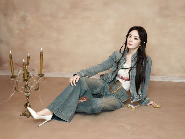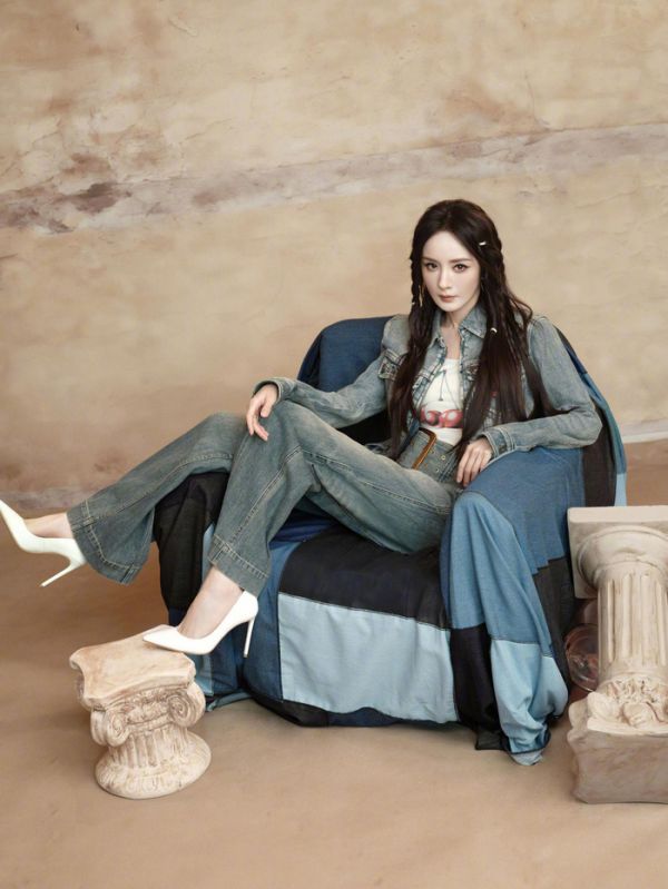 杨幂编发造型搭配牛仔装甜酷感十足