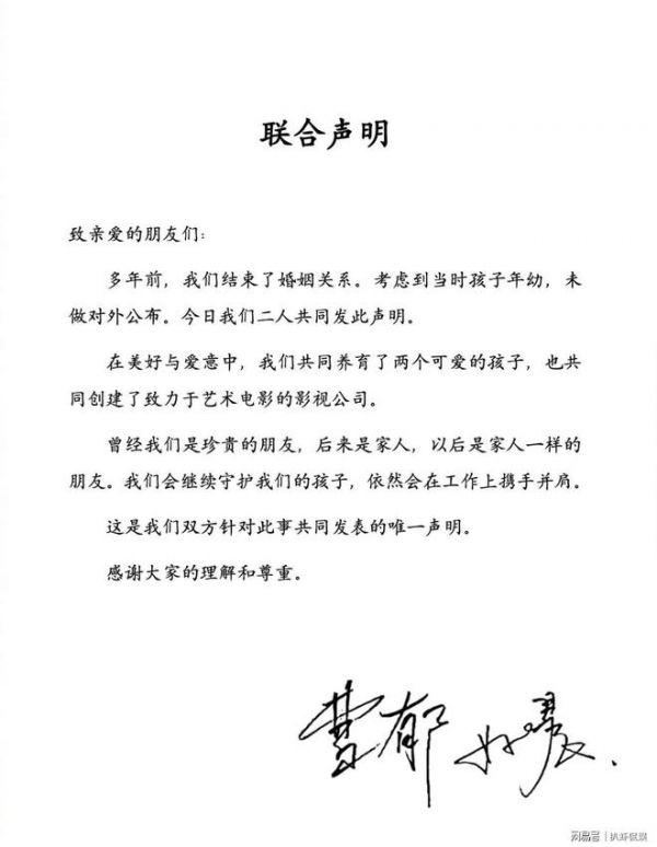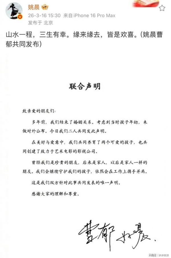 此外,姚晨还晒出一份她与曹郁签署的共同声明,声明中提到,她与曹郁其实早在多年前就结束了婚姻关系,至于为何没有对外官宣,是两人考虑到当时孩子年幼,现在孩子也长大了,是时候对外公开他俩离婚的消息了。