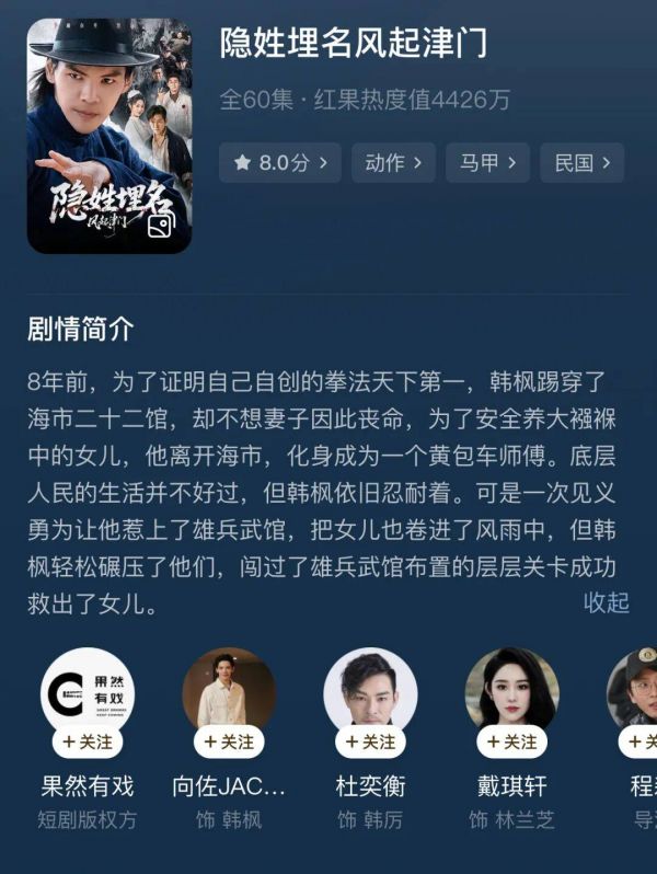 不过男频短剧的惯性就是闷声发财,一个更清晰的信号则是专业团队与动作演员的到来。李连杰高调客串《源力江湖》,向佐已经上了一部《隐姓埋名风起津门》。红果“果燃计划”的待播新剧《老兵归来之当打之年》由樊少皇主演,有吴京的影武堂参与。