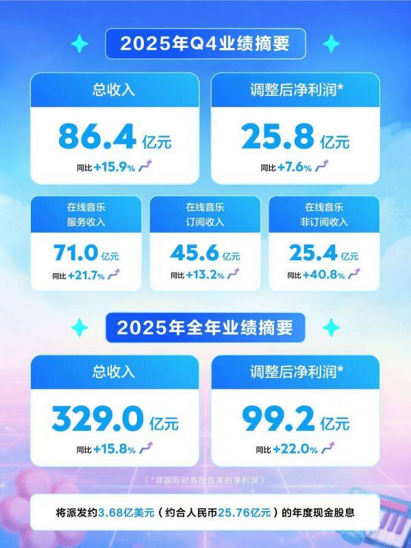 在3月17日盘后披露的腾讯音乐2025第四季度及全年财报中,2025年第四季度总收入为人民币86.4亿元,同比增长15.9%。调整后净利润25.8亿元,同比增长7.6%。2025年全年总收入为329.0亿元人民币,同比增长15.8%。调整后净利润99.2亿元,同比增长22.0%。