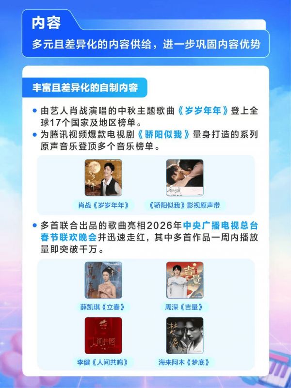 腾讯音乐具备制造“流行”的能力,这是其达成生态循环的最核心指标。报告期内,腾讯音乐制作家工作室与肖战工作室联合出品的的中秋主题歌曲《岁岁年年》上线后迅速走红,登上全球17个国家及地区榜单。为电视剧《骄阳似我》打造的系列原声音乐登顶多个音乐榜单。多首联合出品的歌曲也亮相2026年中央广播电视总台春节联欢晚会并迅速走红,其中多首作品一周内播放量即突破千万。